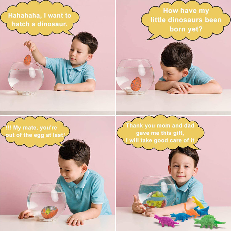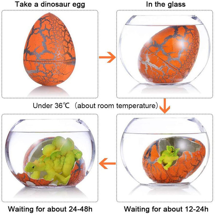 تخم جادویی دایناسور را داخل ظرفی از آب بیندازید و تا 6 - 12 ساعت منتظر بمانید تا دایناسور کوچولو تخم خود را بشکند و بیرون بیاید و حسابی کودکان شما را شگفت زده و سرگرم کند ، بعد از خروج دایناسور تا 4 روز آن را داخل آب نگهداری کنید تا کاملا بزرگ بشود . سپس دایناسور ژله ای را از آب بیرون بیاورید .