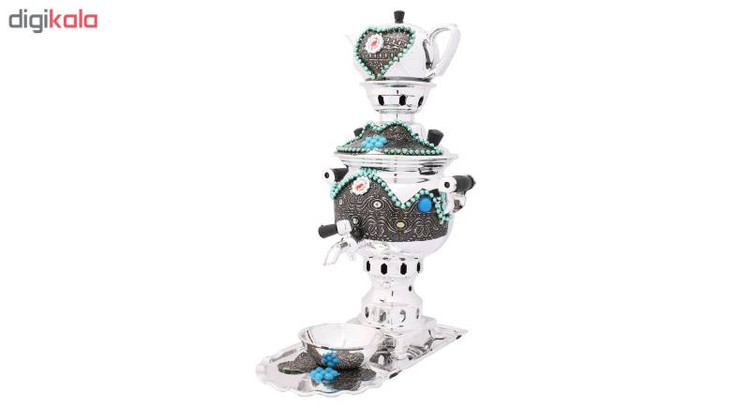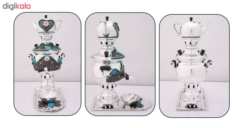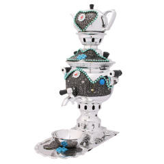 سرویس سماور زینتی که در تصویر مشاهده میکیند در مدل دکوری طراحی و با بدنه ای تزئین شده با نقوش برجسته بسیار زیبا عرضه گردیده است. این سرویس دکوری شامل سماور، قوری، سینی و کاسه می باشد که از جنس فلز در رنگ نقره ای تولید شده است و شما میتوانید مطابق با دکوراسیون محیط آن را انتخاب و خریداری نمائید. سماور زیبای این ست و قوری همراه آن با نگین های سفید و فیروزه ای تزئین گردیده است که موجب چندین برابر شدن زیبایی محصول میشوند. طراحی سنتی این ست سماور، رنگ زیبای بدنه ی آن در کنار نقوش برجسته بسیار زیبای کار شده بر روی بدنه ی محصول سبب می شود تا بتوانید از آن در محیط های مختلف جهت تزئین دکوراسیون استفاده نمائید.